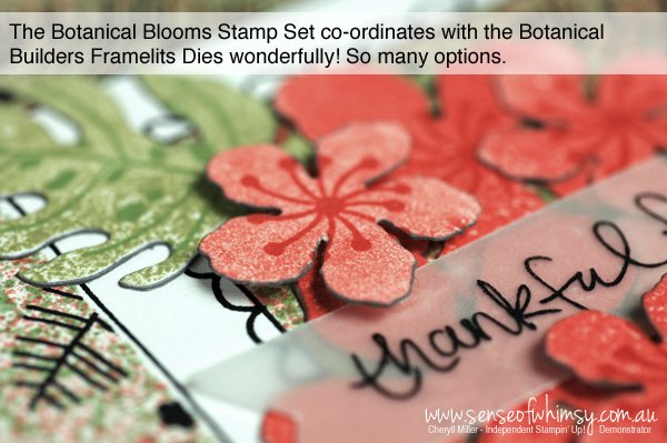 There are a few different options for floral dies in the Botanical Builder Framelit Die set. I chose to stamp the solid flowers and leaf and then die cut them with the co-ordinating framelits. I have used Calypso Coral ink for the flowers, and Pear Pizzazz and Wild Wasabi inks for the leaves. I stamped some images without re-inking to get different tones.