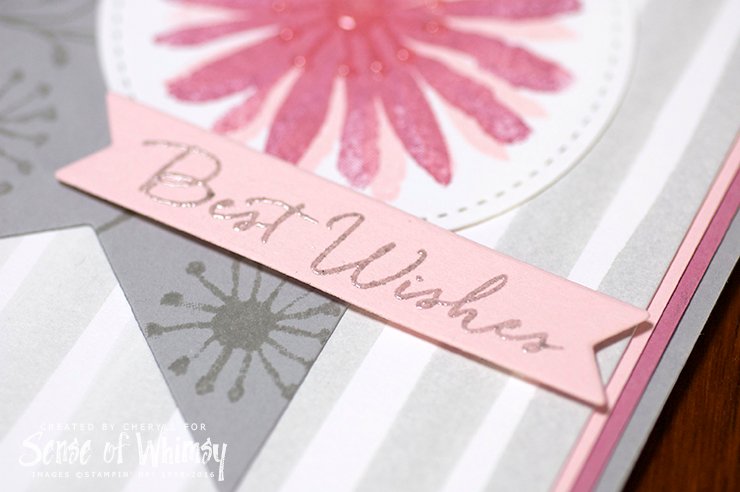 The greeting is also from the Blooms and Wishes stamp set and has been stamped onto a scrap of Pink Pirouette cardstock with Versamark ink and Smoky Slate ink and then clear embossed. This little banner die is from the Bunch of Banners Framelits Dies and is fast becoming my most used die for greetings.