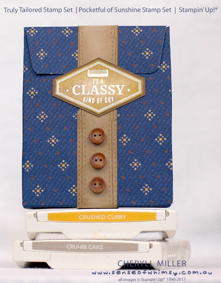 The belt is simply a 2.5cm strip of Crumb Cake card which has been sponge with Crumb Cake ink to look like old leather. The stitching and holes are stamps from the Pocketful of Sunshine stamp set. I added one of the patterned papers from the True Gentleman Designer Series Paper and three little True Gentleman buttons. Cute hey!