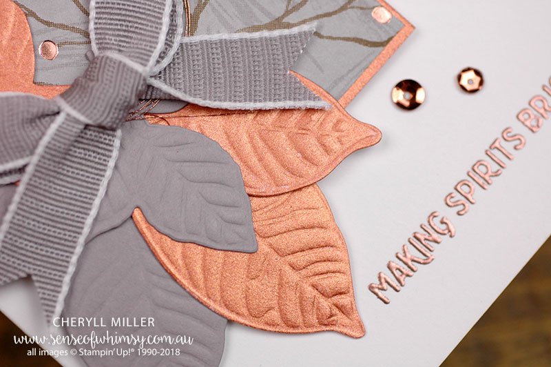 Gold Shimmer Paint – It’s new and coming soon in the Stampin’ Up! Holiday Catalogue. The leaves are die cut and embossed using the specialty embossing dies from the Nature’s Roots Framelits dies and Whisper White cardstock, and then sponged with the shimmer paint!