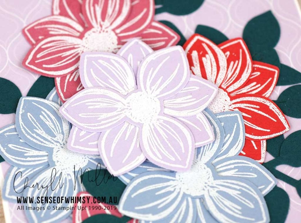 So we are not forgetting Purple Posy and Terracotta Tile, I have created this very different look card using the co-ordinating Perennial Flower Punch. I white embossed heaps of the three-petalled flower image onto four of the In Color card colours, punched them all out and then adhered them in groups of three, to make nine petalled flowers.