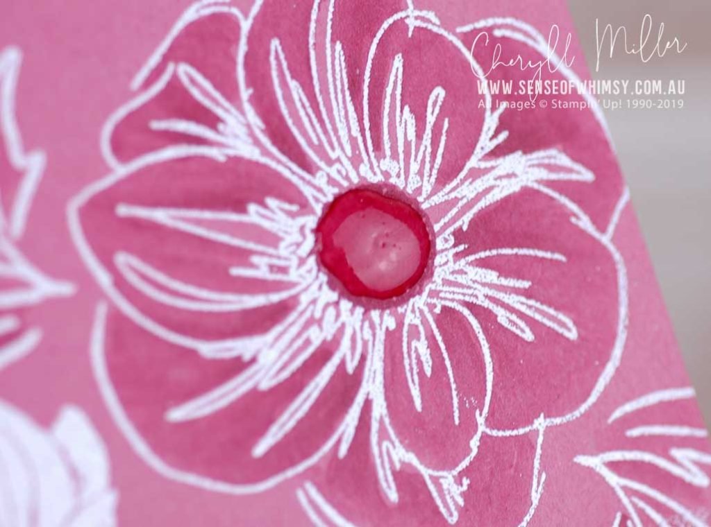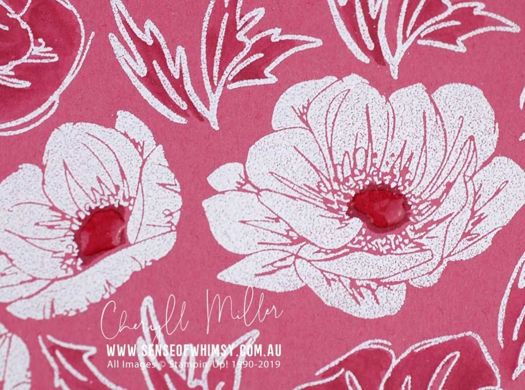 For this one, I have white embossed the flowers onto Rococo Rose cardstock. Again I added shading to the open line flowers and leaves with a Blender Pen and Rococo Rose ink. The white embossed solid flowers just pop off the page.