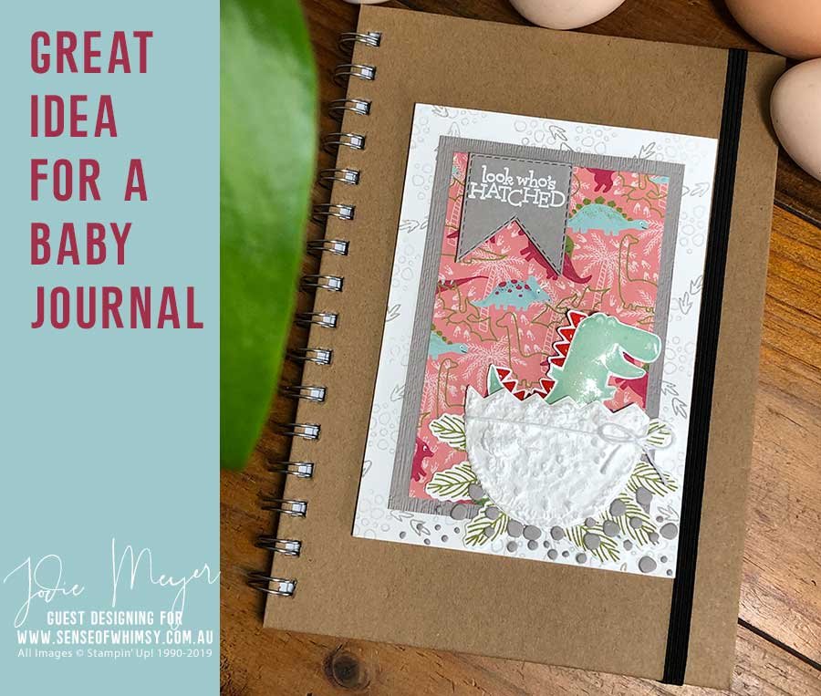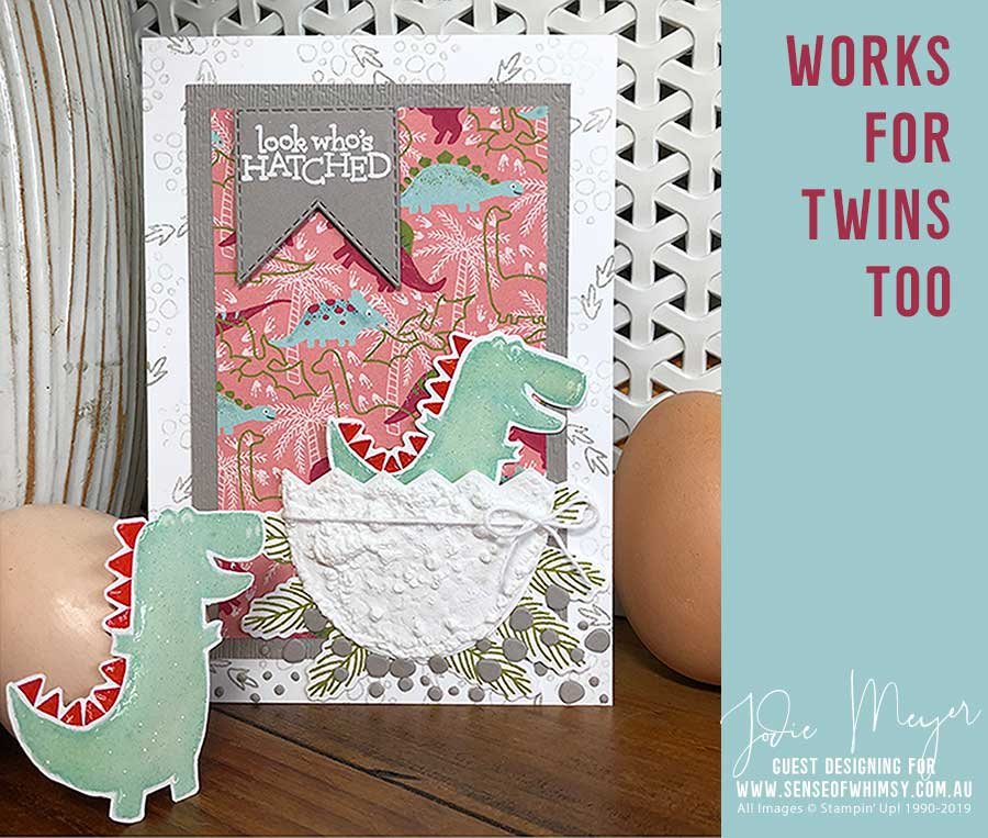 Dino Days is a popular set and perfect for Beginner Crafters. The dinosaurs are easy to stamp up and the greetings are adorable. Jodie has added some dirt “ground” under the dinosaur by simply applying the puff paint across the area and heating. When cooled she used the Crumb Cake Stampin’ Blend and gently coloured all over the puff paint. How clever is this? You could choose green instead if you want a grass patch instead of dirt.
