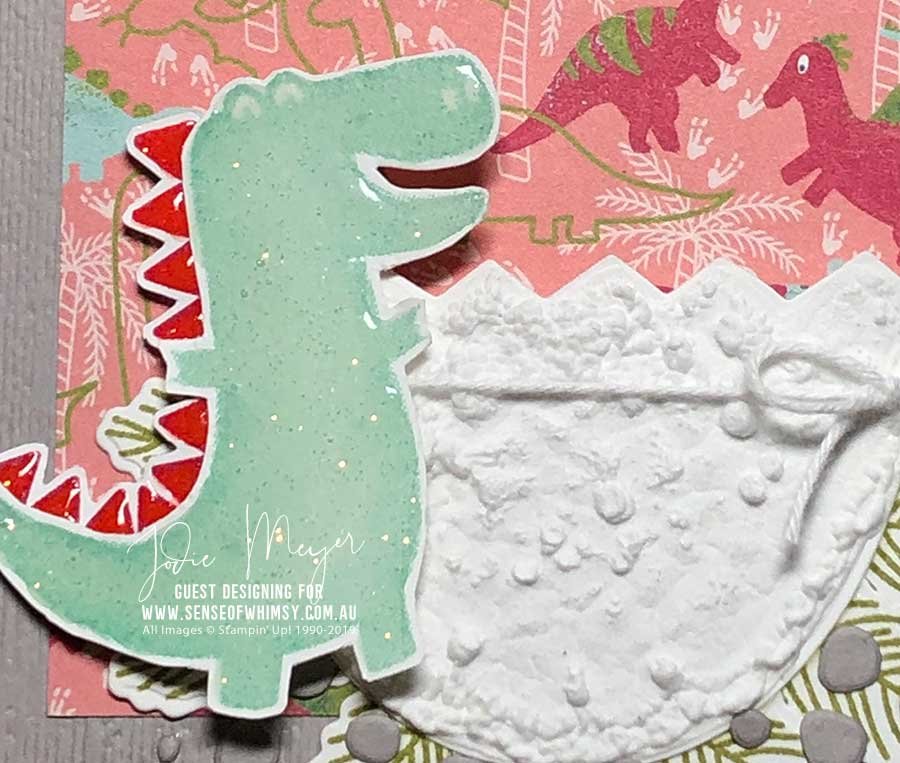 That little dinosaur hatching out of his egg has been coated with the Shimmery Crystal Effects (another new product from the Stampin’ Up! Holiday Catalogue). The little pebbles under the egg are a lovely effect, created from one of the dies from the Dino Dies set. This is such an interesting set of dies.