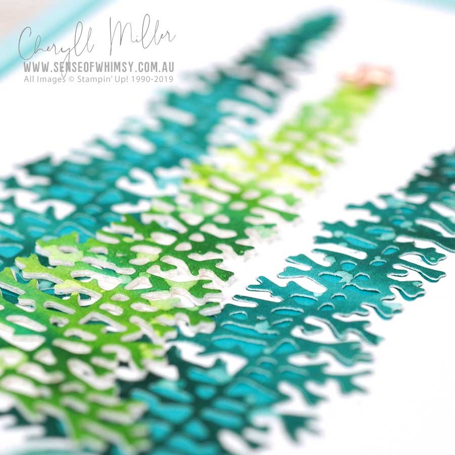 I used Pigment Sprinkles on Shimmery White Cardstock to create coloured panels from which to die cut the trees. The colours used are Bermuda Bay and Granny Apple Green.