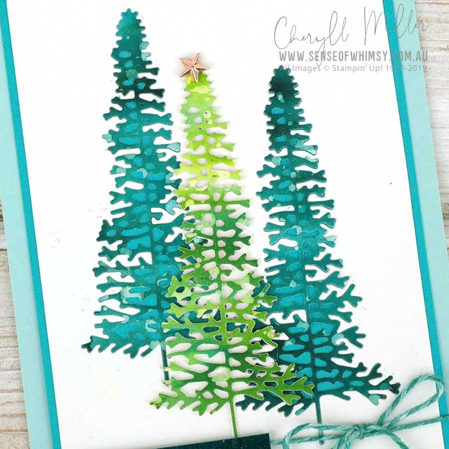 As a Stampin’ Up! demonstrator, I was able to “pre-order” products from the new and amazing Mini Catalogue. One of the products that jumped out at me was the Majestic Mountain Dies. They do co-ordinate with the Mountain Air Stamp Set however, it is the stand alone detailed tree die that really caught my attention, so that is what I have used today.