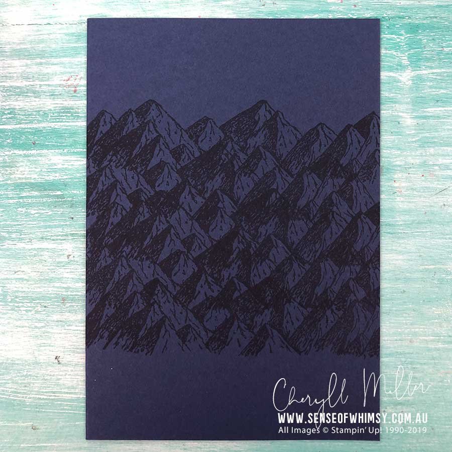 - Stamp the detailed mountains repeatedly across the front of folded Night of Navy Card with Night of Navy ink.