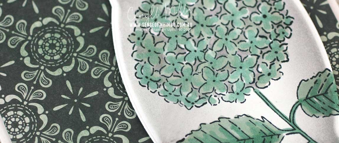 - The Hydrangea is stamped in Black Memento on Basic White and then I coloured it with Stampin’ Blends in Smoky Slate, Mint Macaron and Just Jade.