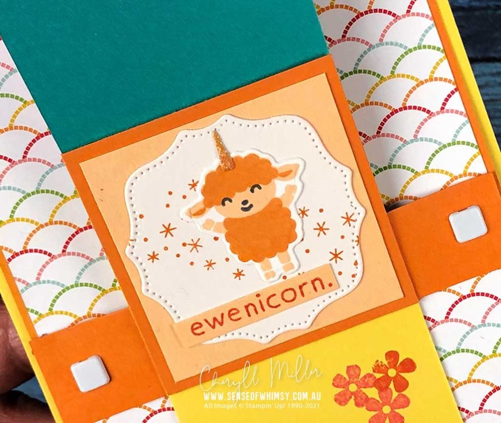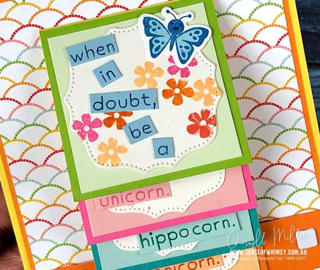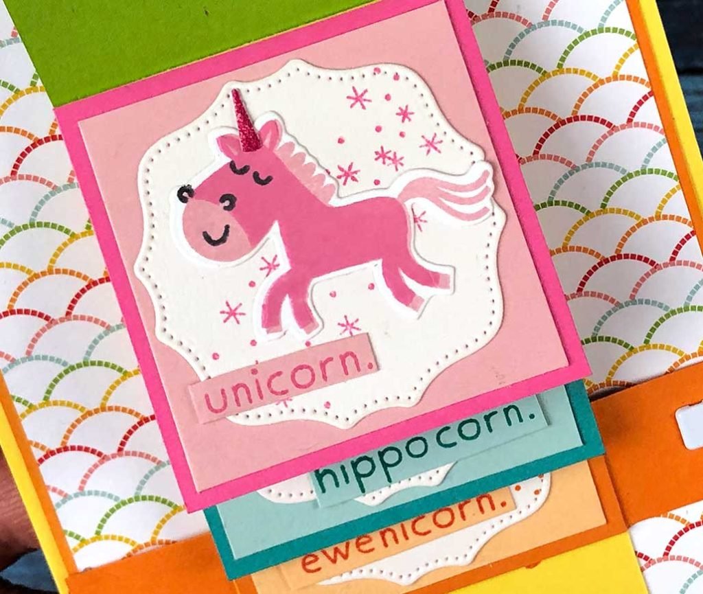 But, the concept is pretty cute! I selectively stamped parts of the sentiments to get those made up animal names. And die cut the teeny weeny unicorn horn die from Rainbow Glimmer Paper … If you are going to have a unicorn horn, you may as well have a sparkly one! 😉