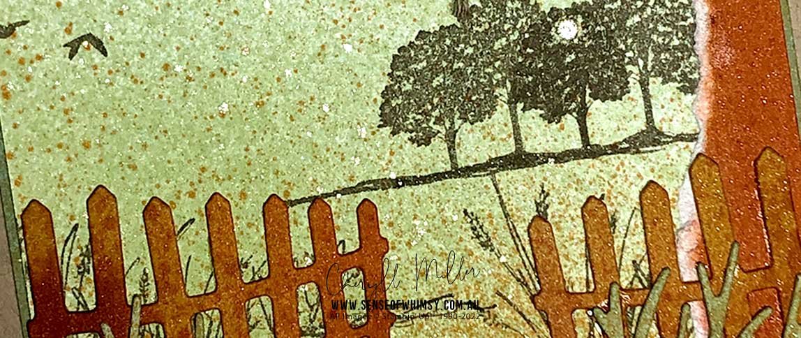 I pulled out my ink spritzers to create the background for this project, using Cajun Craze, Balmy Blue and Pear Pizzazz spritzed onto Shimmery White cardstock. I also spritzed a separate piece of card to create the die cut elements and matting layer, rather than use coloured cardstock.