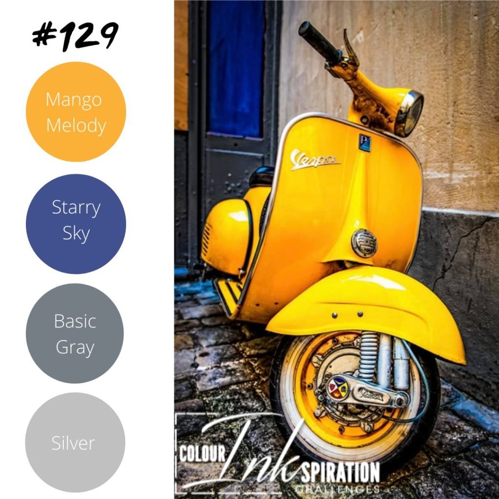 Our CI#129 challenge features Mango Melody, Starry Sky, Basic Gray and Silver. The challenge parameters are to use all four of the challenge colours (or if you don’t have the exact colour, you can substitute a close alternative), and in addition you can use neutrals such as Basic White, Very Vanilla, Crumb Cake, Sahara Sand and Basic Black.
