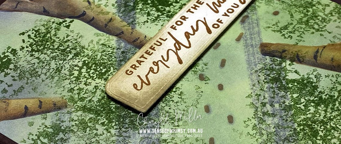 I then used the textural image from Season of Chic stamp set to create some “scrubby bushes” under the trees. I highlighted the footsteps with a Stampin’ Blend, and voila … I know have a much more typical Aussie bush type scene.