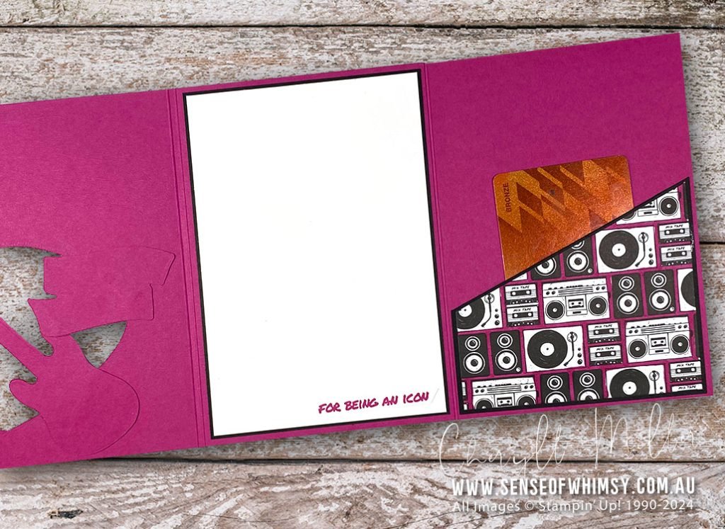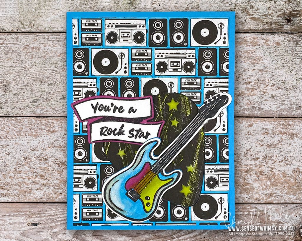 - The Designer Series Paper used on the front of the card has been coloured with Berry Burst Stampin’ Blends, making those Rock & Roll Music Making images just jump off the page.