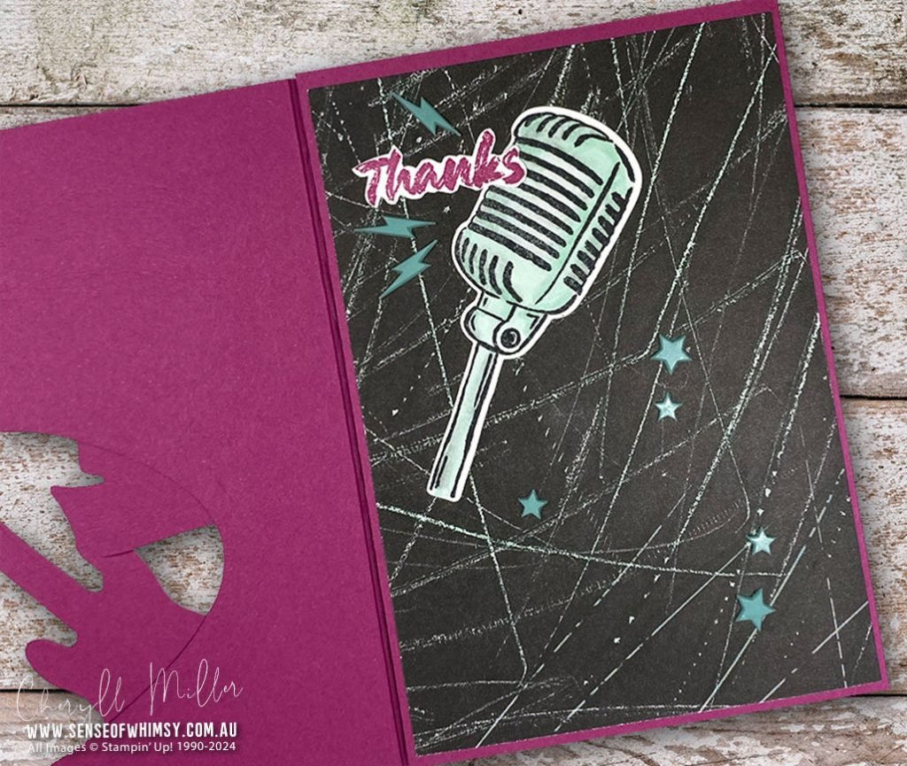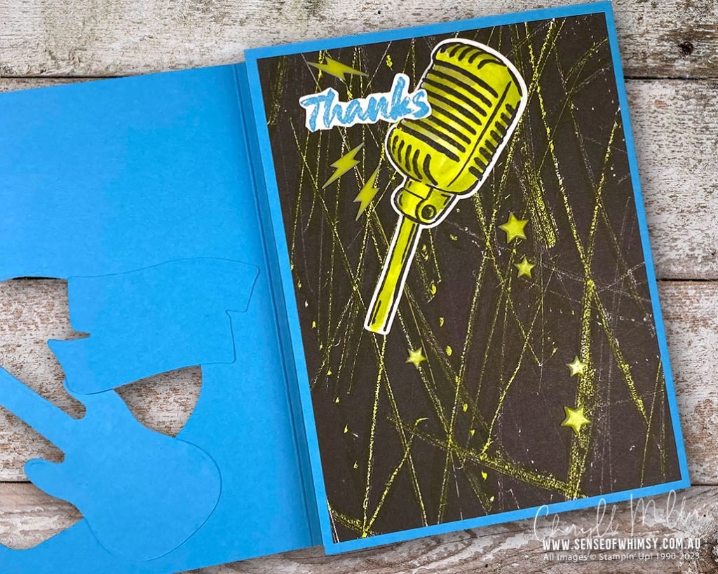 - I coloured the microphone with Pool Party Stampin’ Blends, die cut and adhered to the inside flap (so it didn’t show through to the front of the card), and then added a fussy cut “thanks” and some adhesive backed lightning.