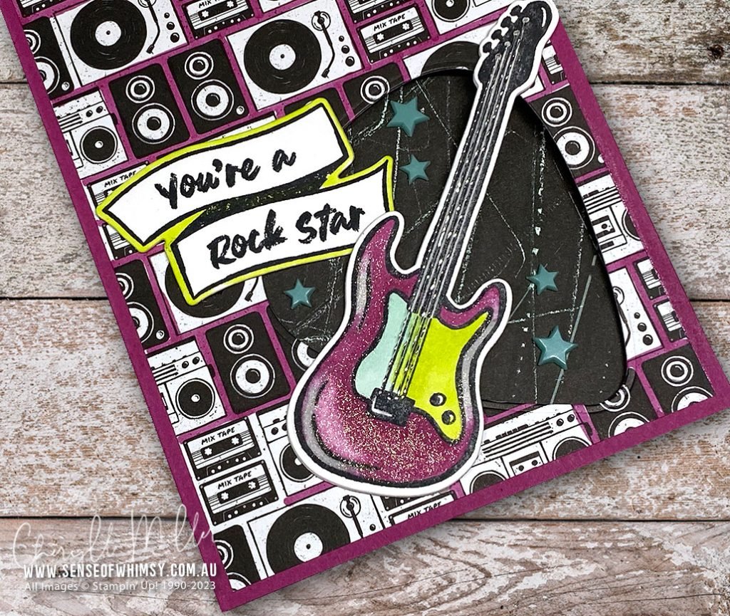 - The Electric Guitar has been coloured with Stampin’ Blends in Berry Burst, Lemon Lime Twist and Pool Party, with a touch of Smoky Slate.