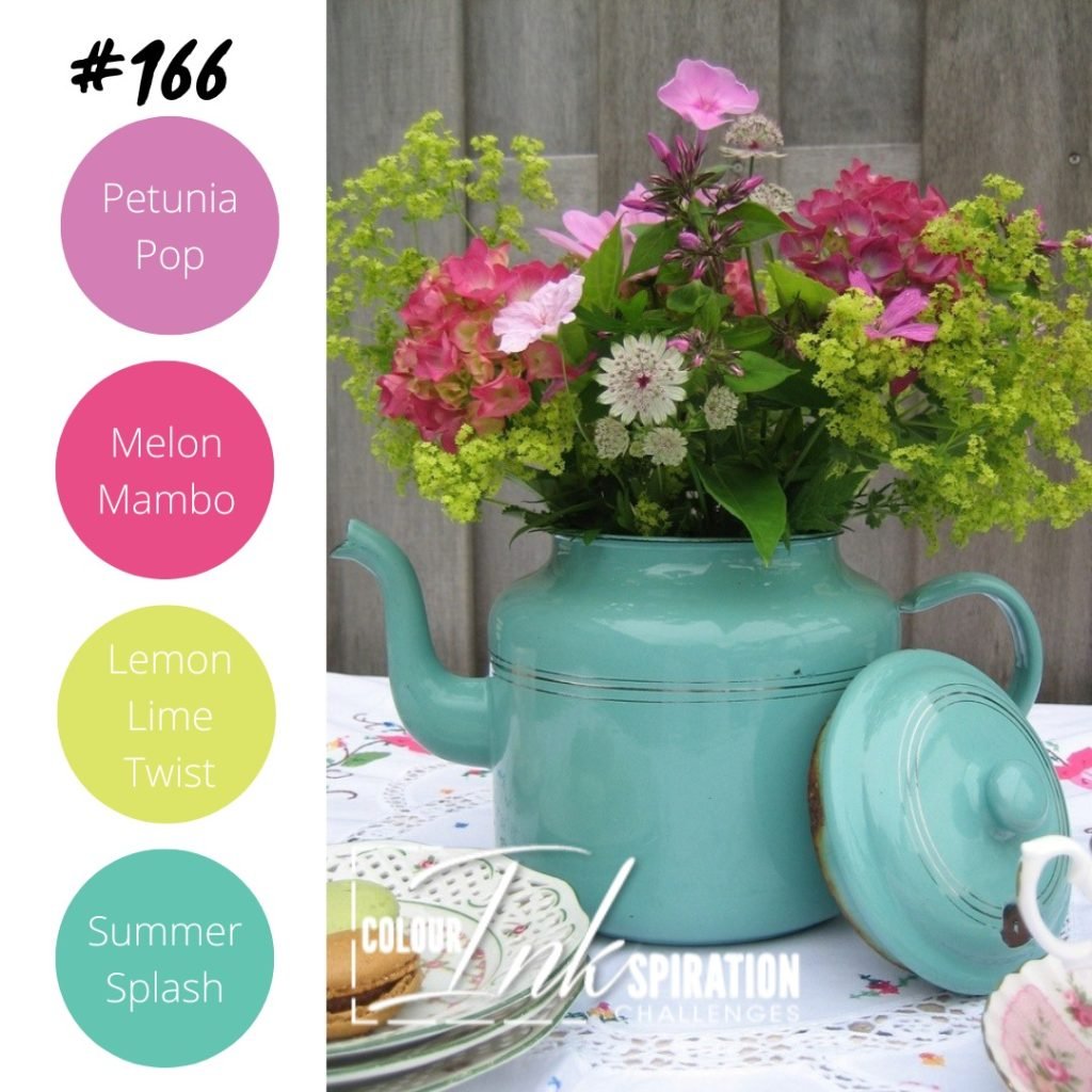 Welcome to my blog. Today’s post is for Colour INKspirations Colour Challenge #166. Our inspiration pic for this challenge was chosen by design team member, Lou Kitzelman. Don’t you just want a teapot/flower vase like this amazing pot? I love it. For CI#166 we welcoming two more of the new 2024-2026 In Colours: Petunia Pop and Summer Splash, along with two bright favourites, Melon Mambo and Lemon Lime Twist.