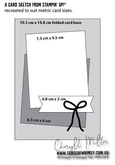 Our creative team, Inks and Whimsy, have been getting together to make cards on a Thursday night online. It’s a low key fun night, and this week we re-visited an old technique …the baby wipe technique. We also worked to a sketch, very kindly supplied by Stampin’ Up!® in the new 2024-2025 catalogue (Page 22). I have re-created the sketch to suite metric sized cards and added some suggested measurements.