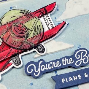 - The plane is coloured with Stampin’ Blends, which allows me to get that cool translucent effect with the Soft Seafoam. A little circular swish of Clear Wink of Stella Glitter brush completes the feeling of movement in the propellor. The clouds have been given little strokes of Smoky Slate here and there, but mostly left white.
