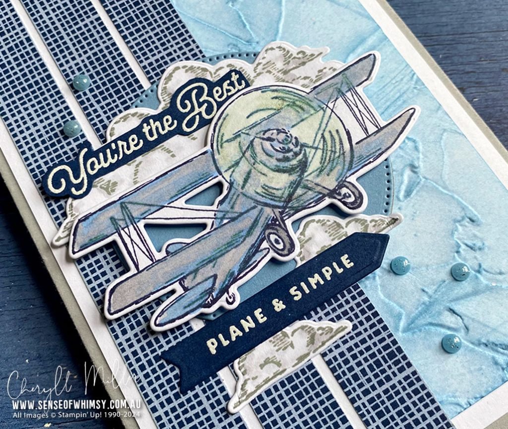 Take to the Sky Suite from the Stampin’ Up!® 2024-2025 Annual Catalogue is a fabulous set for masculine cards, or for travel orientated recipients of all ages. The Stamp Set and Dies are bundled, the Designer Series Paper features vintage aeronautical themes and the Industrial Trinkets are amazing.