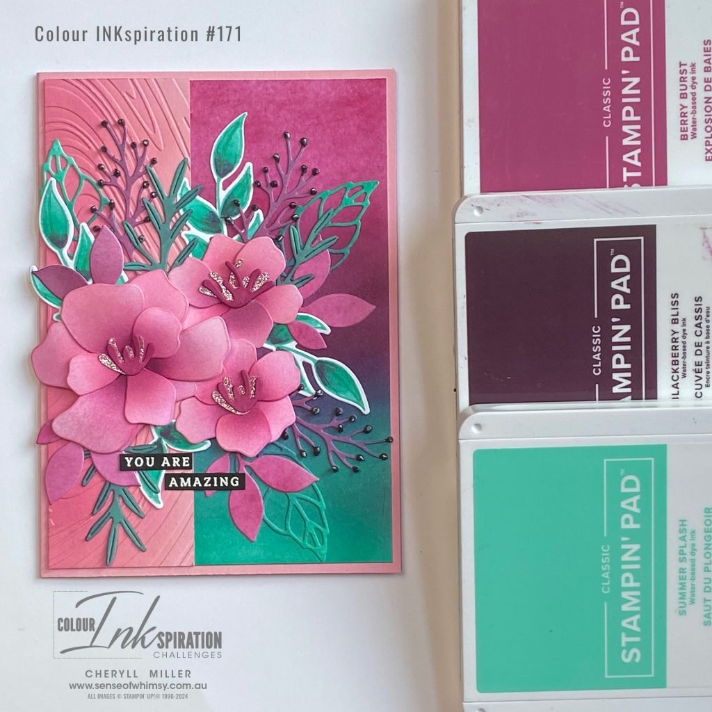 This card was a joy to create, and as I added more and more elements, the list of products used became numerous! My favourite part of the card is the blended background using Berry Burst, Blackberry Bliss and Summer Splash inks. Blackberry Bliss and Summer Splash are a little tricky to blend, but they make a gorgeous colour transition.