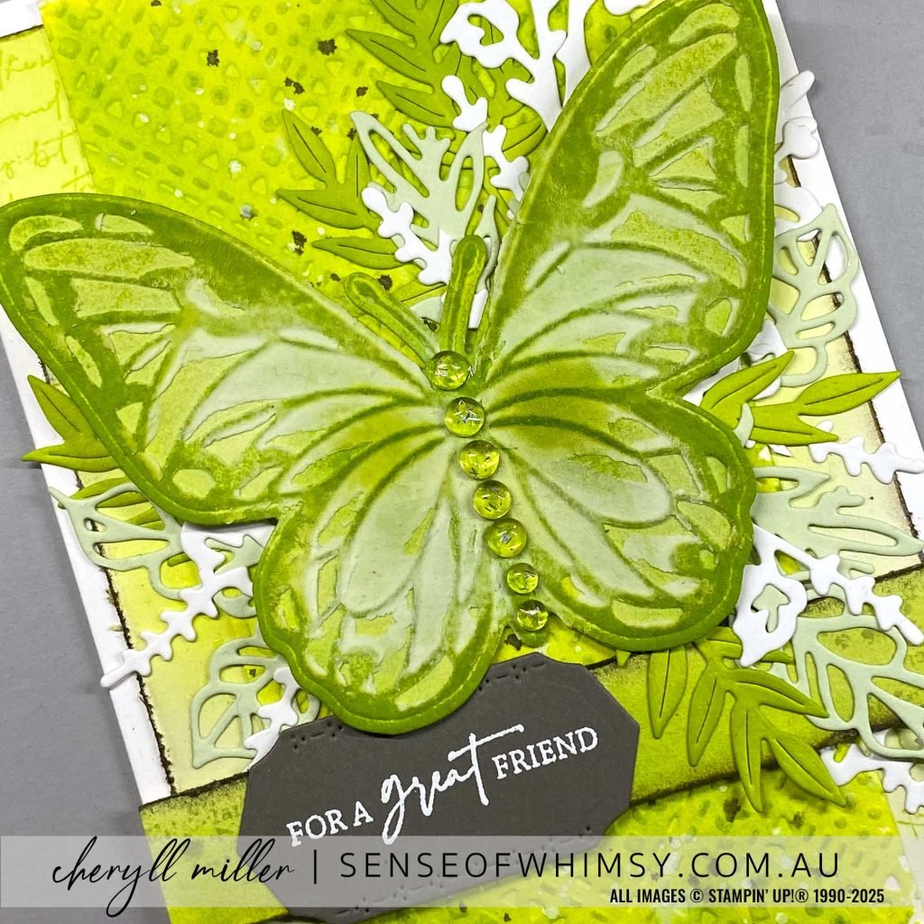 Here is a closer look at the embossing paste on the butterfly, it really tones down the bright green colouring. As does the lighter White and Soft Seafoam foliage die cuts tucked in behind the butterfly.