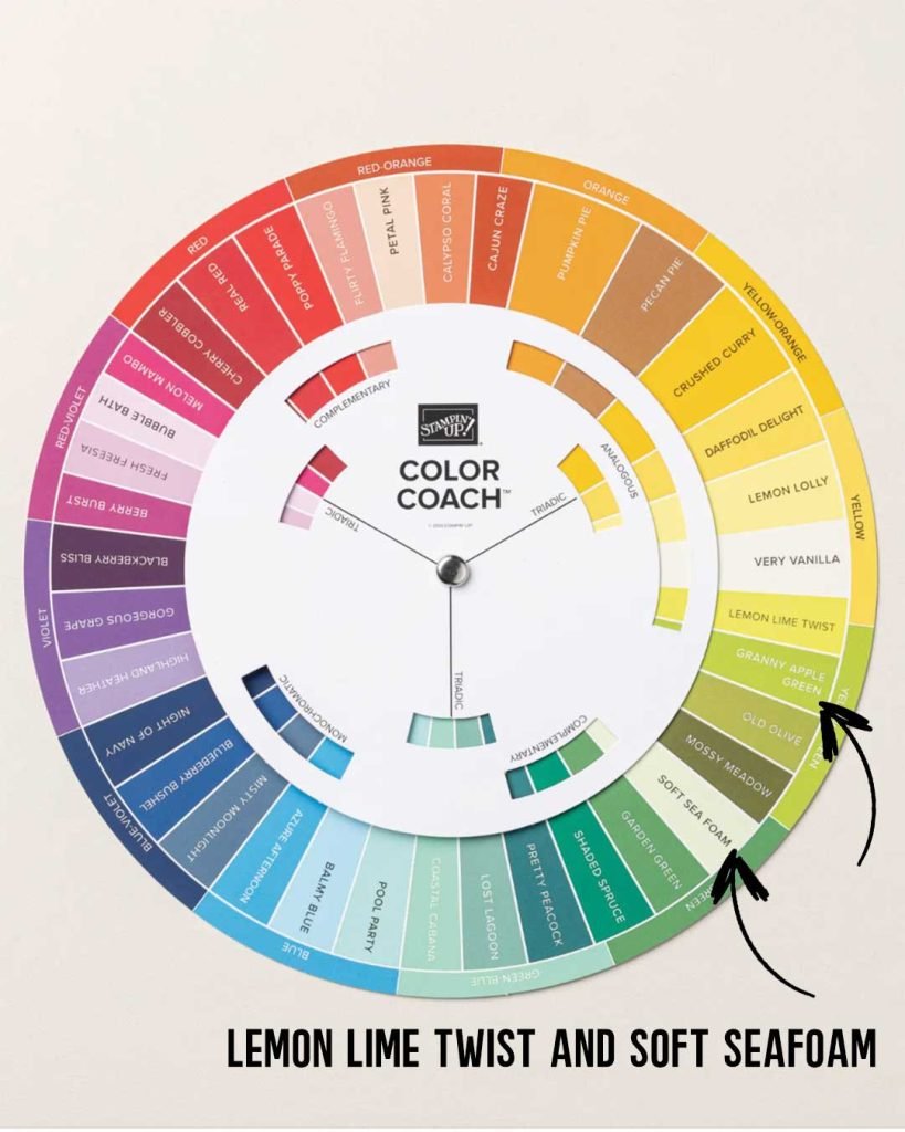 This month our challenge was to choose two colours from the Stampin’ Up!® Colour Wheel and create a card using those colours. I chose Lemon Lime Twist and Soft Seafoam … not a colour combination I would have chosen normally. And apparently not next to each other on the Stampin’ Up! Colour Wheel. I have an older colour wheel and on mine those two colours are next to each other … that is my story and I am sticking to it.