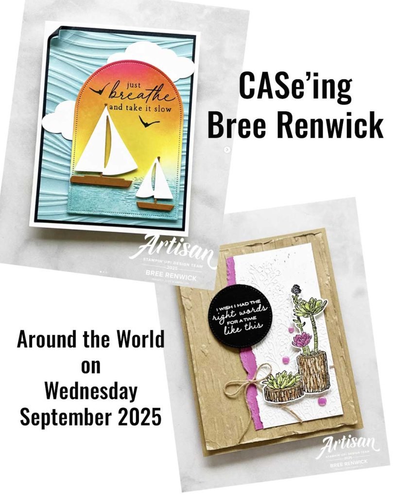 In celebration of our 5th year, we are continuing with a series of “team member focus” blog hops where we will be CAS(e)ing an individual team member for that blog hop. Our team member focus this month is the fantastic Bree Renwick from USA. Bree is an Artisan Design Team Member for Stampin’ Up! and so it is very humbling to be CASe’ing her. Scrolling through Bree’s Instagram page is a cornucopia of fabulous projects … her style is clean and bright, with colourful impact using a variety of techniques.