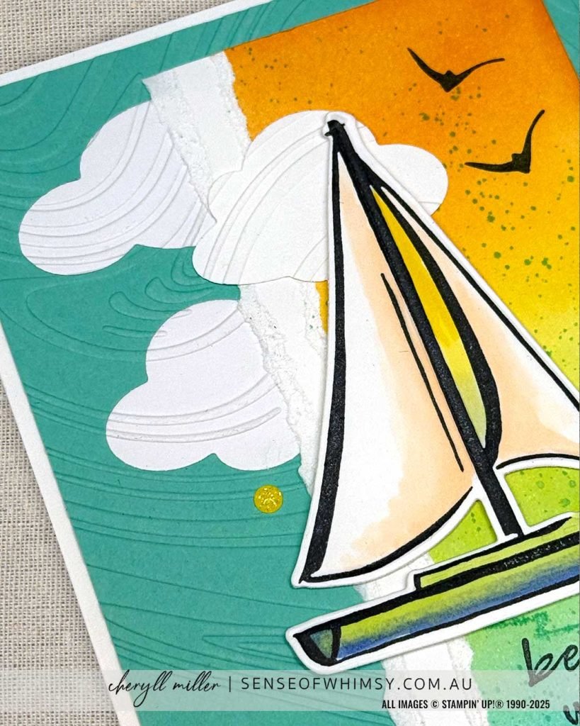 Bree used the dies from Sunrise Sailing bundle for her sail boats, I elected to stamp and colour my sail boat using Stampin’ Blends … A single boat, as per my original project.