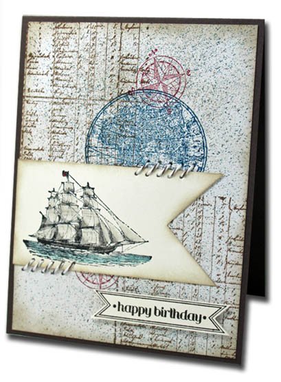 This is that very first card I blogged back in 2013, using the Open Sea Stamp Set. This was very much my style back in those days … messy, grungy, lots of splattering and distressing. I am still a messy, grungy girl at heart, but my style as evolved over the years. So let’s celebrate the memories of where I came from creatively, mixing in a little bit of Bree’s style as well.