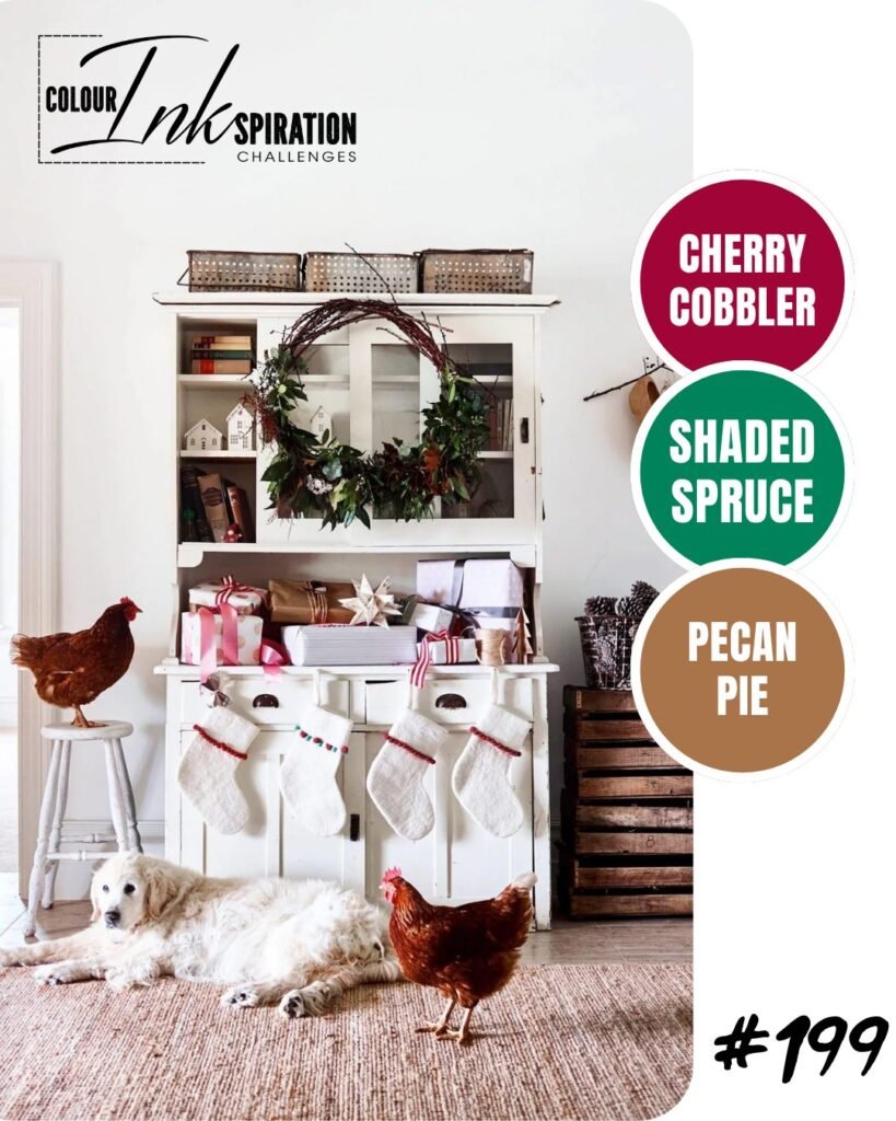 Cherry Cobbler, Shaded Spruce and Pecan Pie are all very strong shades, and my first combination was very “in your face” … so using the inspiration graphic as a guide, I toned them down by introducing a neutral shade, Basic Beige.