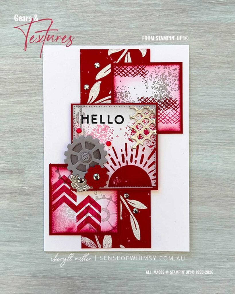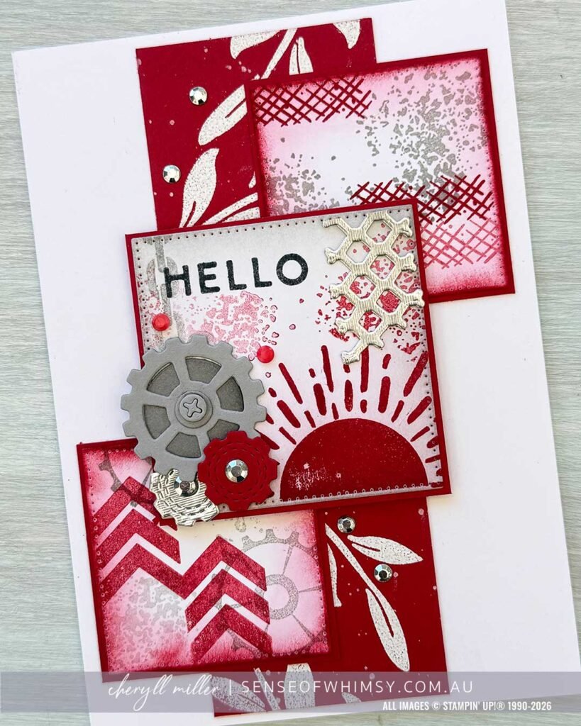 • The square panels are cut from Basic White card using the Stylish Shapes Dies. The smaller two squares are 4.7 cm (1-7/8″) square and the larger square is 6cm (2-7/8″) square. I stamped them with various textural images from Gears & Textures in Real Red and Smoky Slate. Remember to stamp some images in full strength ink and some stamped off to create that depth.