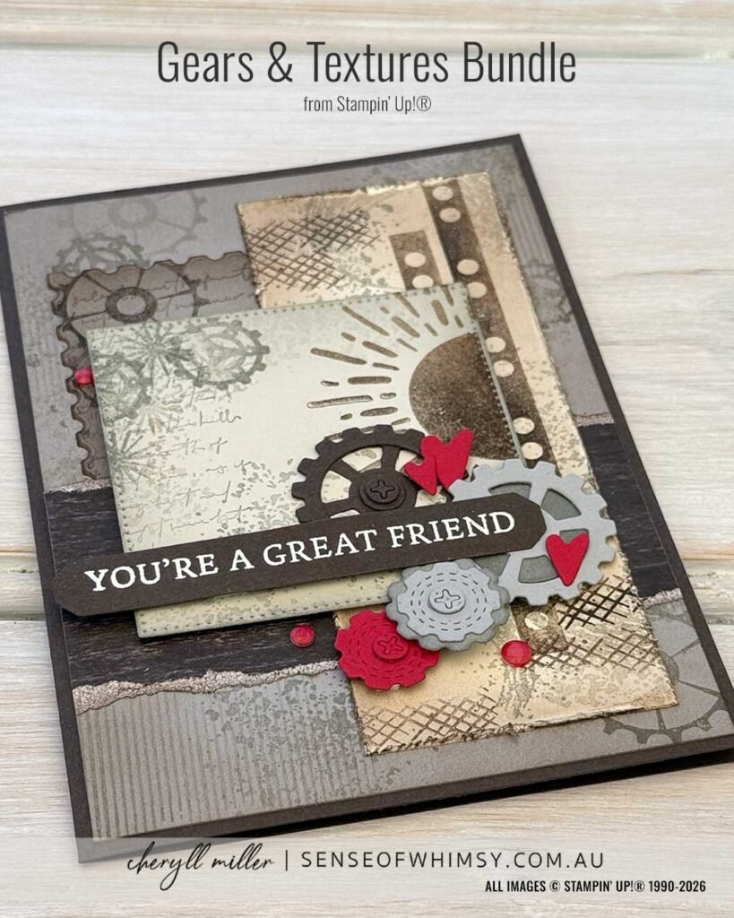 Can you tell … I am absolutely loving the Gears & Textures bundle. I have used it with different colours, created in very different styles and combined it with many other Stampin’ Up! products.