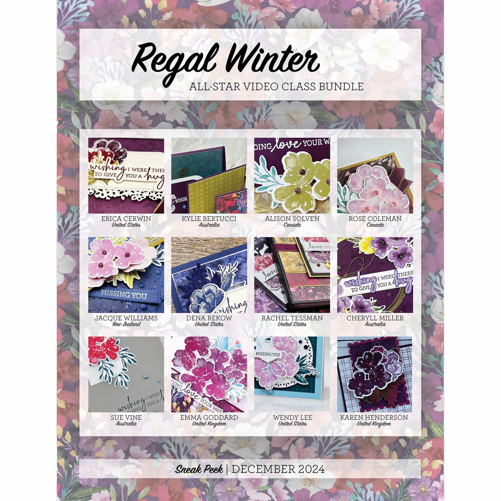This bundle of 12 class videos is created by the All Star Video Class Bundle Design Team and each class uses product from the Regal Winter Suite of products featured in the Stampin’ Up! September 2024 to December 2024 Mini Catalogue.